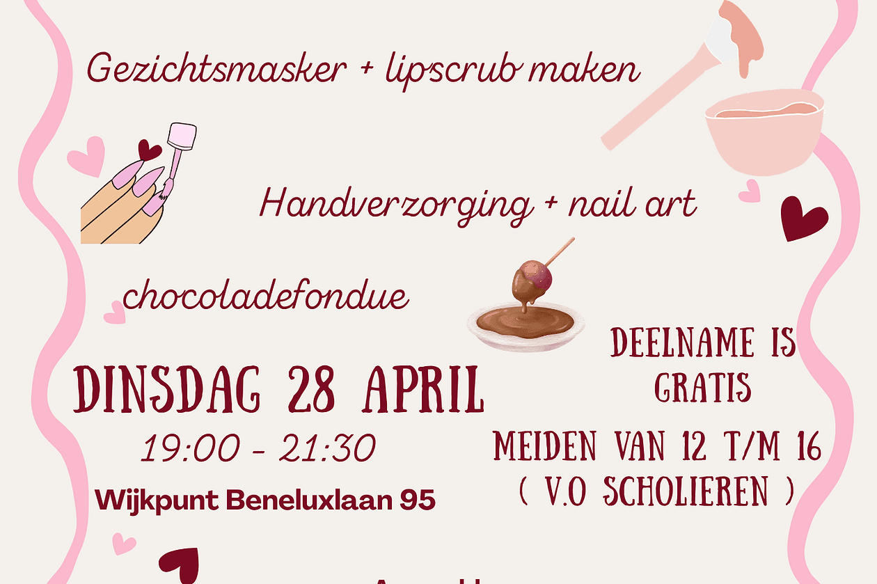 Toe aan een gezellige en ontspannen avond met andere meiden? Kom naar onze Self Care Tuesday! Tijdens deze meidenavond ga je lekker aan de slag met self care: maak je eigen gezichtsmasker en lipscrub, verzorg je handen en lak je nagels.
