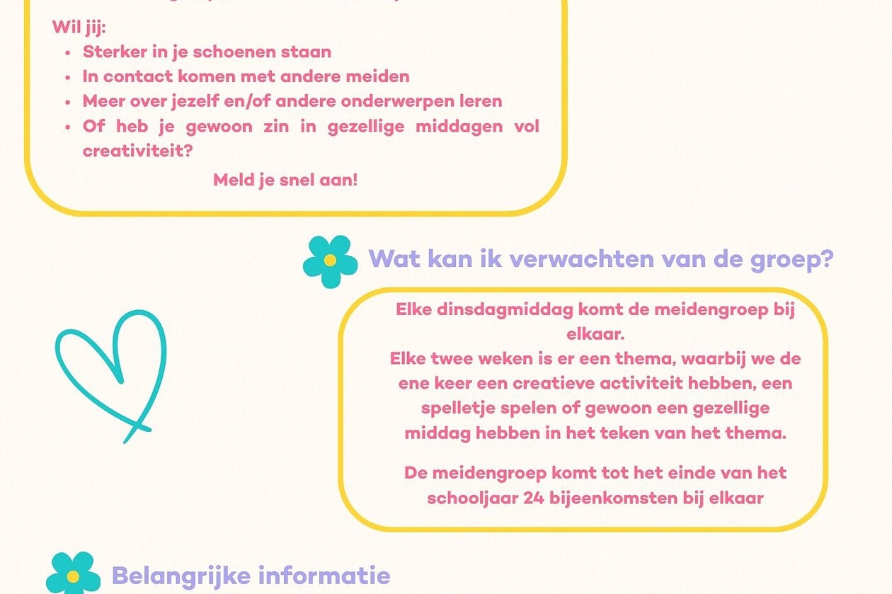 De meidengroep is voor meiden uit Beverwijk die in groep 7 of 8 zitten.